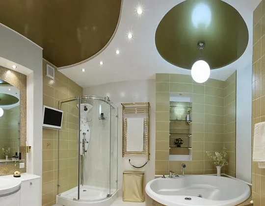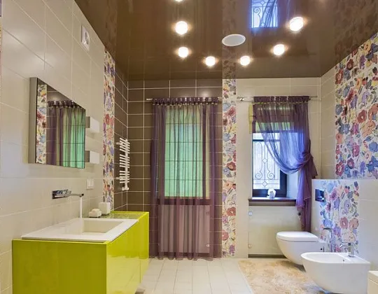 Потолок цвета шоколада прекрасно будет смотреться в ванной, даже если она не отличается большими размерами. Белая сантехника, блестящие металлические детали, удачно расположенное освещение и гармонично подобранный кафель или стенные панели сделают помещение просто роскошным.
