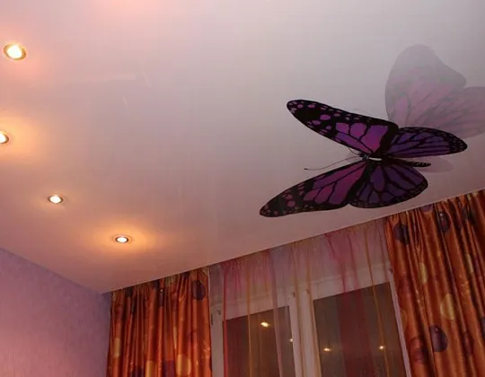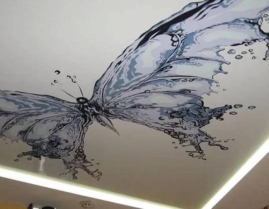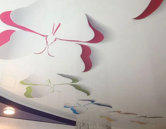 В каталог вошли 3Д изображения всех цветов и размеров. Здесь вы можете найти подходящий рисунок. Это могут быть бабочки, которые сидят на цветах, ветках, порхают в воздухе. Их можно расположить как по всему полотну, так и для декорирования угла и вокруг люстры.