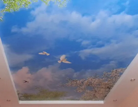 Фотографии натяжного потолка с фотопечатью «Небо с облаками» впечатляют разнообразием исполнения данной технологии. Так, за основу вы можете взять любую из работ, представленную в галерее нашего сайта или в сети интернет. А если желаете создать уникальный рисунок, покажите нам эскиз, который мы доработаем и выполним. Нам под силу выполнить потолок любой конфигурации.